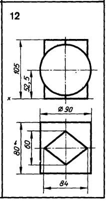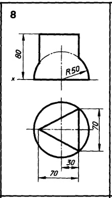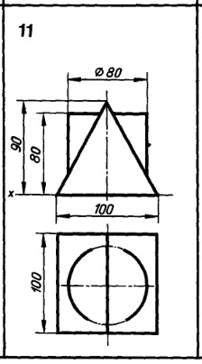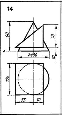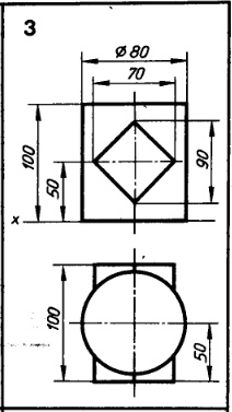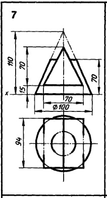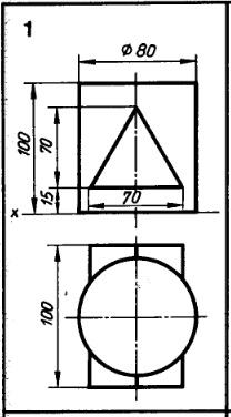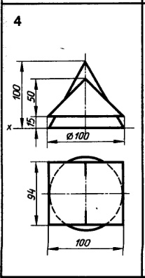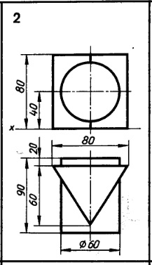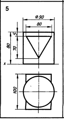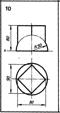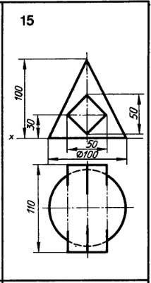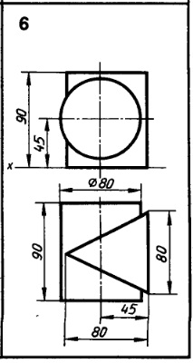 По двум проекциям геометрических тел (многогранника и тела вращения) построить третью проекцию и изометрию. Построить линии пересечения поверхностей этих тел.