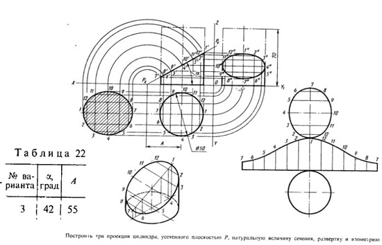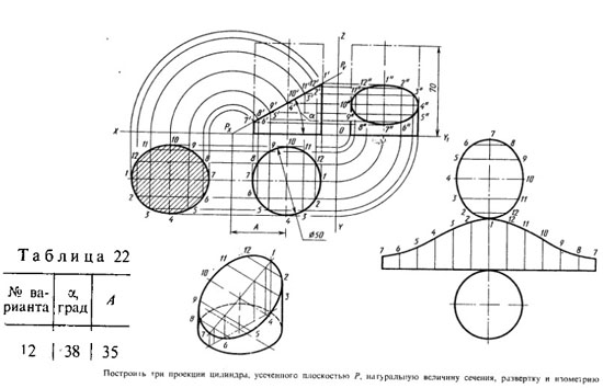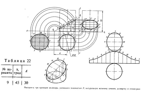 Построить три проекции цилиндра, усеченного плоскостью Р, натуральную величину сечения, развертку и изометрию.