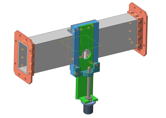 Фланцы 3 крепятся к волноводу 2 винтами 10. Уголки 4 крепятся также к волноводу винтами 9. Направляющая планка 1 крепится к уголкам волновода винтами 10. Головку 8 насаживают на гладкий конец винта 7 и закрепляют штифтом 11. Затем стойку 5 прикладывают к направляющей планке 1, запрессовывают штифты 11 и завинчивают винты 10. Далее винт 7 вводят в паз скользящей планки 6 и ввинчивают резьбовое отверстие стойки 5, предварительно вставив скользящую планку 6 в щель, образованную направляющей планкой 1 и стойкой 5.
