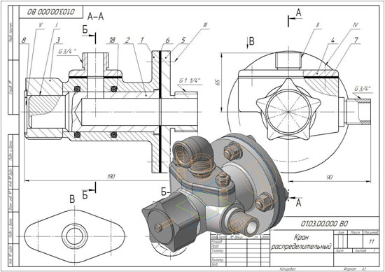 Распределительный кран предназначен для одновременной или попеременной подачи жидкости по двум трубопроводам. Кран состоит из корпуса 1 и пробки 2. Уплотнение пробки осуществлено кольцами 18 (кольцо 045-053-46-2-4 ГОСТ 9833-73*). К корпусу подсоединяются три трубопровода: к резьбовым патрубкам фланца 5 и корпуса 1 и к угольнику, навернутому на фланец 4. Герметизация корпуса и фланца 4 осуществляется прокладкой 7, а фланца 5 и корпуса – прокладкой 6. На пробке установлена рукоятка 3 с помощью шайбы 8. Поворот рукоятки позволяет одновременно или попеременно перекрывать отверстия, сообщающиеся с трубопроводами.