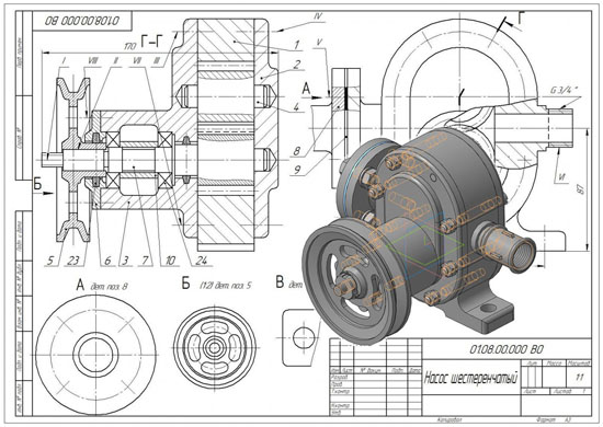 Насос – машина для перемещения жидкости или получения сжатых газов. Насос состоит из корпуса 1, крышки 2 и фланца 3. В корпусе установлены шестерня 4 и вал-шестерня 7. Цилиндрический конец вала 7 посажен на подшипники 24 (подшипник 203 ГОСТ 8338-75), установленные во фланце 3. Подшипники расперты втулкой 10 и поджаты крышкой 6. На конце вала 7 закреплен шкив 5. Герметизация вала 7 осуществляется кольцом 23 (кольцо СГ 32-22-3,5 ГОСТ 418-81/МН180-61). Трубопроводы подсоединяются через муфту, навернутую на резьбовой патрубок корпуса 1 и к фланцу 8. Между корпусом 1 и фланцем 8 установлена прокладка 9. При вращении шестерен в полости насоса образуется вакуум, в который засасывается жидкость и перегоняется зубьями шестерен к фланцу 8.