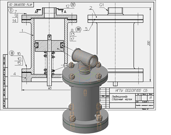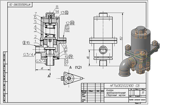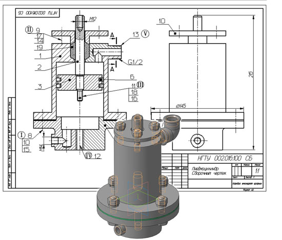 I – соединить крышку 2 с корпусом 1 болтами 7 (резьба М10), установить шайбы 14 и гайки 9; II – выполнить соединение основания 4 с корпусом 1 шпильками 16 (резьба М12), установить шайбы 15 и гайки 10; III – закрепить поршень 3 посредством шайбы 13, гайки 8 (резьба М8) и шплинта 17; IV – соединить штуцер крышки 2 с тройником 12 (резьба G1). Заполнить в спецификацию графу Стандартные изделия.