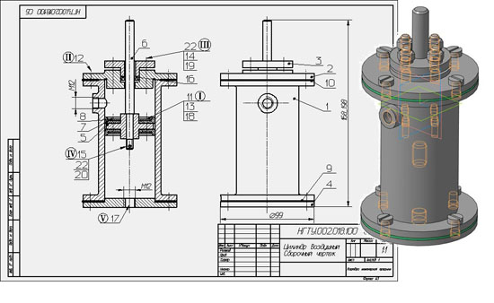 I – соединить диски 8 с поршнем 5 болтами 11 (резьба М6), установить шайбы 18 и гайки 13; II – выполнить соединение корпуса 1 с крышками 2 и 4 винтами 12 (резьба М8); III – выполнить соединение крышки 3 и крышки 2 шпильками 21 (резьба М8), установить шайбы 19 и гайки 14. IV – закрепить поршень 5 на штоке 6 посредством гайки 15 (резьба М12), шайбы 10 и шплинта 22; V – ввернуть в крышку 4 пробку 17 (резьба М12х1,5). Заполнить в спецификации графу Стандартные изделия