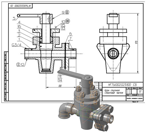 Спускной кран является одним из видов арматуры трубопроводов и предназначается для спуска жидкости из системы. Кран состоит из корпуса 1, в котором установлена коническая пробка 2. В верхней части корпуса установлена втулка сальника 4, уплотняющая сальниковую набивку 16. Между набивкой и верхним основанием конической части пробки установлена втулка 3. Втулка сальника 4 крепится к корпусу 1 шпильками 15, шайбами 13 и гайками10. Для поворачивания пробки в нужное положение на верхнем цилиндрическом конце ее закреплена при помощи установочного винта 9 рукоятка 5. Фланец 7 крепится к корпусу при помощи болтов 8, шайб 14 и гаек 11. На резьбовом патрубке корпуса необходимо установить угольник 12. На чертеже кран изображен в открытом положении. При повороте рукоятки 5 пробка 2, вращаясь, меняет поперечное сечение или полностью перекрывает отверстие, через которое проходит жидкость. К корпусу подсоединяются два трубопровода (на чертеже они не показаны), по которым проходит жидкость. С одной стороны трубопровод подсоединяется к резьбовому концу фланца 7, а с другой – к угольнику 12. Полное прилегание сопряженных поверхностей пробки 2 и корпуса 1 достигается конической формой этих деталей. Уплотнение пробки 2 осуществляется при помощи сальниковой набивки 16. Для избежания утечки жидкости между корпусом 1 и фланцем 7 установлена прокладка 6.