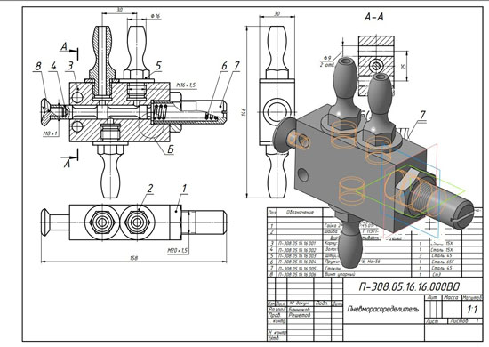 Пневмораспределитель П-308.05.16.16.000 СБ Пневмораспределитель П-308.05.16.16.000 спецификация Пневмораспределитель П-308.05.16.16.000 3d сборка Пневмораспределитель П-308.05.16.16.000 чертежи Корпус П-308.05.16.16.001 Золотник П-308.05.16.16.002 Штуцер П-308.05.16.16.003 Пружина П-308.05.16.16.004 Стакан П-308.05.16.16.005 Винт упорный П-308.05.16.16.006