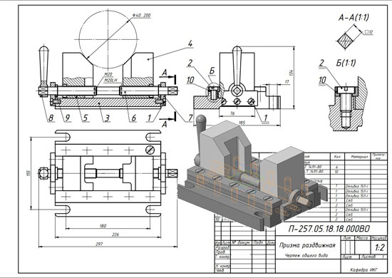 Раздвижная призма служит в качестве фиксированной опоры при обработке деталей диаметром 40 ... 200 мм на сверлильных, расточных, фрезерных и строгальных станках. Она состоит из корпуса, который фиксируется относительно инструмента шпонками (шпонка на чертеже не показана) и крепится станочными болтами. Призматические губки по направляющим корпуса передвигают вращением винта (с правой и левой резьбой).