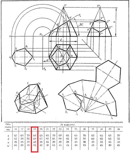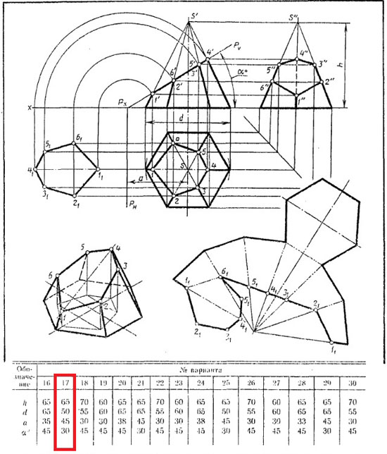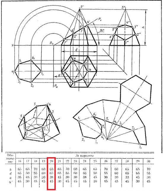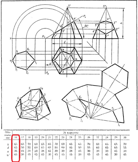 Выполнить чертеж усеченной пирамиды. Найти действительную величину контура фигуры сечения. Построить аксонометрическую проекцию и размвертку поверхности усеченной пирамиды.